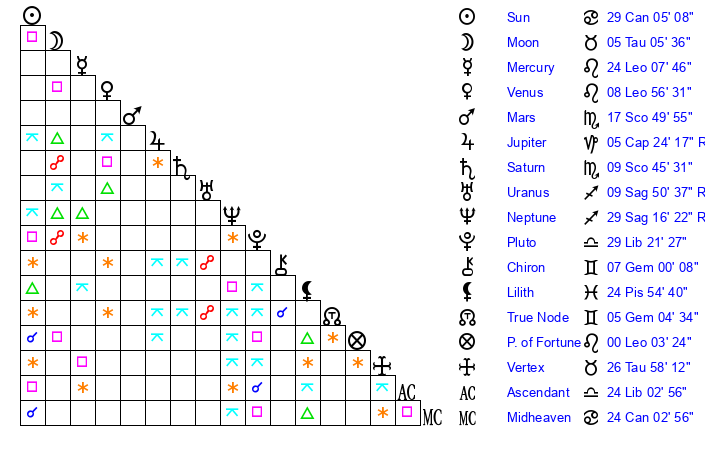 | Venus | 8 Leo 57 | 19 Gemini 8 | 29 Virgo 23 |
