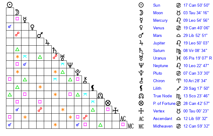 | Sun | 17 Cancer 51 | 18 Cancer 27 | 29 Libra 44 |