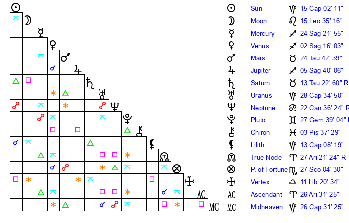 Sun | 15 Capricorn 2 | 16 Capricorn 38 | 8 Taurus 1 |