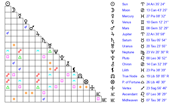 | Sun | 24 Aries 35 | 25 Aries 0 | 16 Cancer 20 |