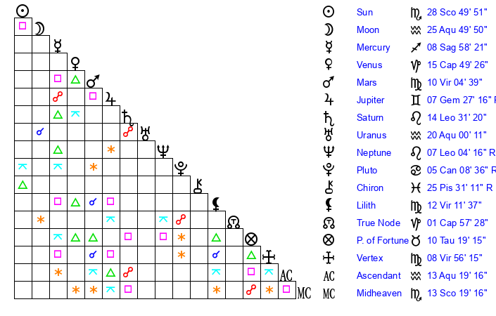 | Sun | 28 Scorpio 49 | 29 Scorpio 53 | 17 Pisces 19 |