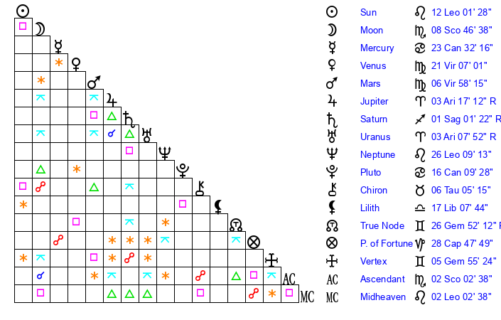 | Neptune | 26 Leo 10 | 1 Aries 54 | 29 Leo 4 |