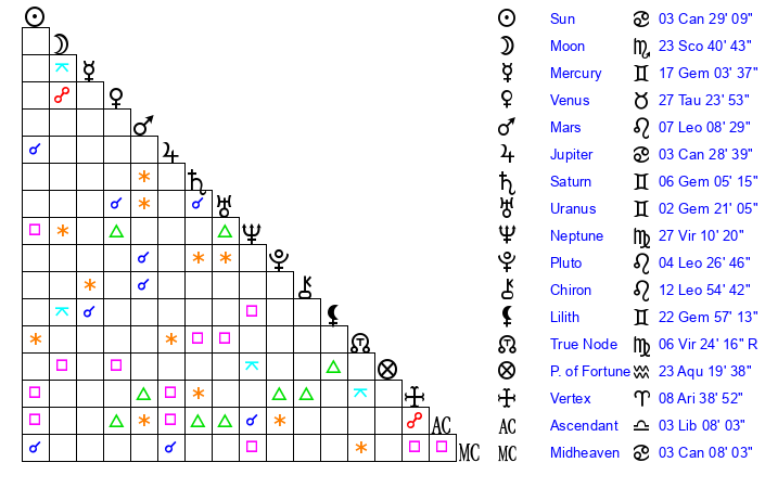 | Sun | 3 Cancer 29 | 4 Cancer 23 | 23 Virgo 11 |