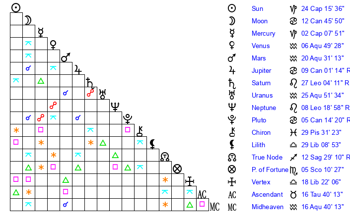 | Venus | 6 Aquarius 50 | 12 Pisces 37 | 16 Gemini 47 |