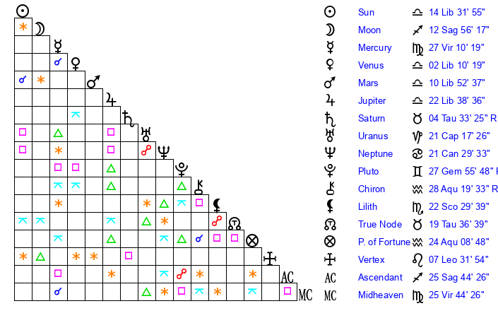 | Moon | 12 Sagittarius 59 | 7 Taurus 11 | 26 Aquarius 16 |