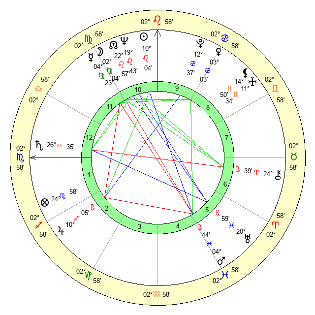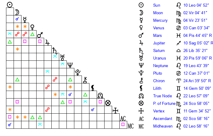 | Moon | 2 Virgo 14 | 23 Scorpio 31 | 21 Taurus 5 |