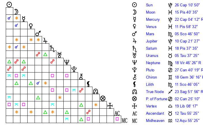 | Mercury | 22 Capricorn 3 | 12 Capricorn 9 | 12 Taurus 57 |