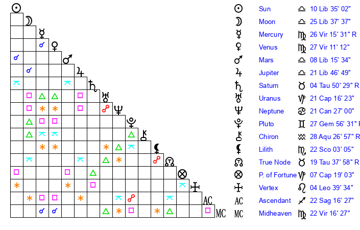 | Sun | 10 Libra 35 | 11 Libra 43 | 6 Aquarius 40 |