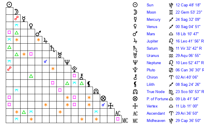 | Sun | 12 Capricorn 48 | 14 Capricorn 20 | 28 Aries 6 |