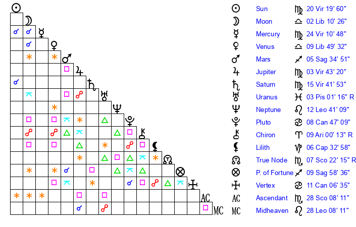 | Saturn | 16 Virgo 20 | 28 Pisces 59 | 25 Virgo 26 |