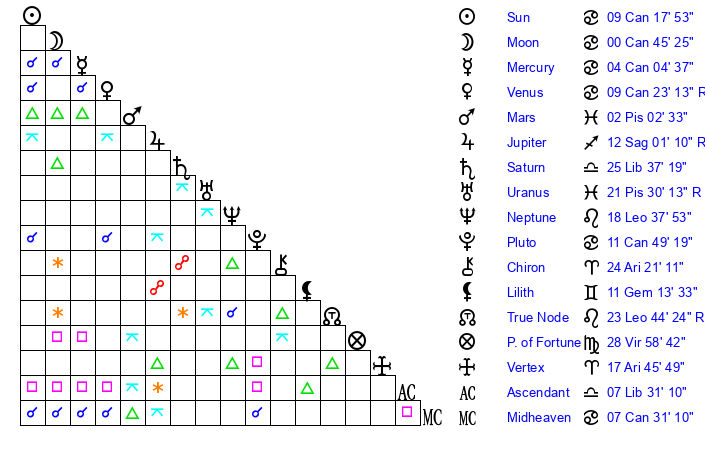 | Moon | 0 Cancer 49 | 24 Virgo 53 | 18 Pisces 9 |