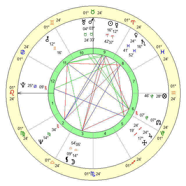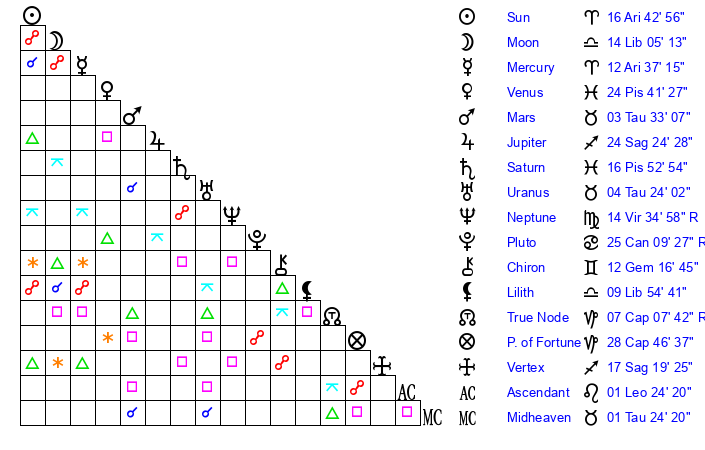 | Moon | 14 Libra 3 | 6 Leo 44 | 12 Capricorn 18 |