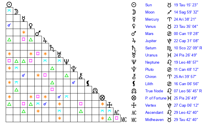 | Sun | 19 Taurus 15 | 20 Taurus 3 | 24 Leo 58 |