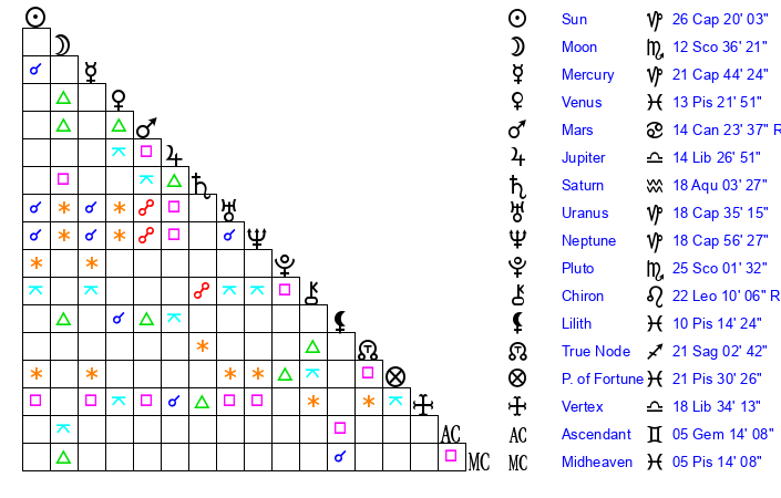 | Mercury | 21 Capricorn 44 | 11 Capricorn 46 | 16 Pisces 6 |