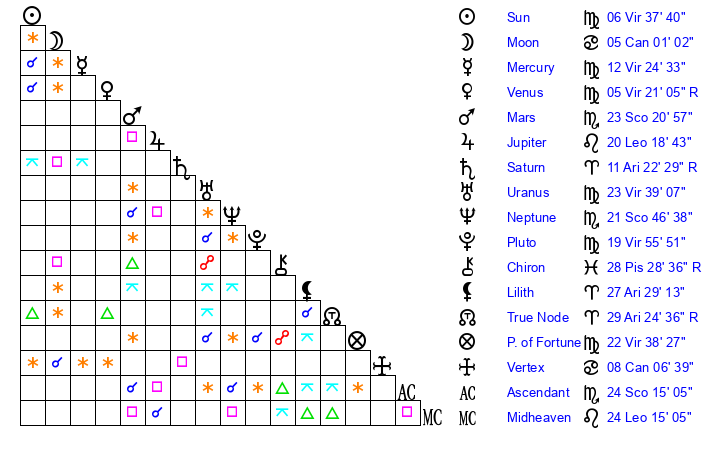 Venus | 5 Virgo 21 | 6 Leo 0 | 17 Virgo 39 |