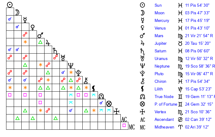 Mars | 21 Virgo 22 | 17 Cancer 17 | 9 Virgo 32 |