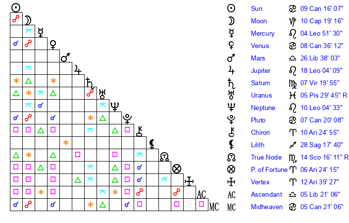 | Moon | 10 Capricorn 20 | 24 Virgo 53 | 19 Scorpio 25 |