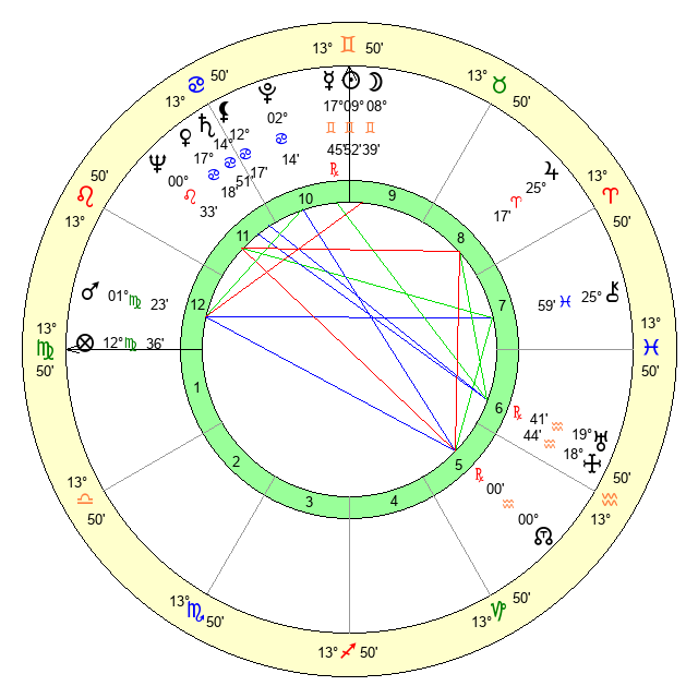 | Moon | 8 Gemini 31 | 11 Leo 44 | 7 Gemini 36 |