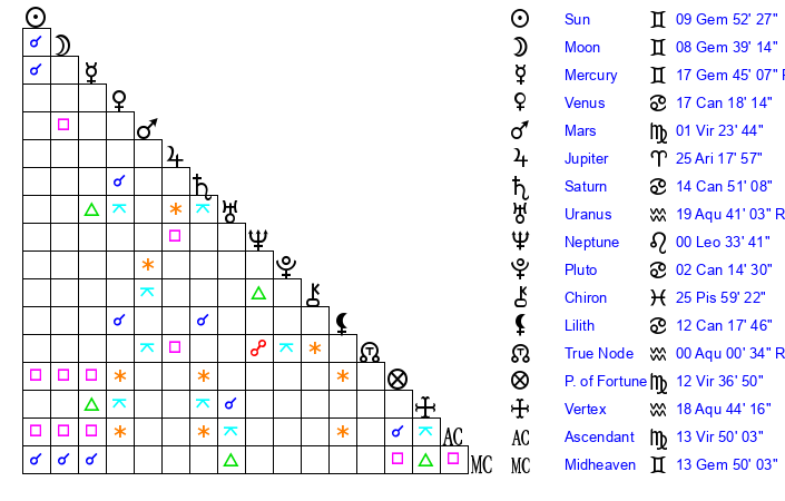| Moon | 8 Gemini 31 | 11 Leo 44 | 7 Gemini 36 |