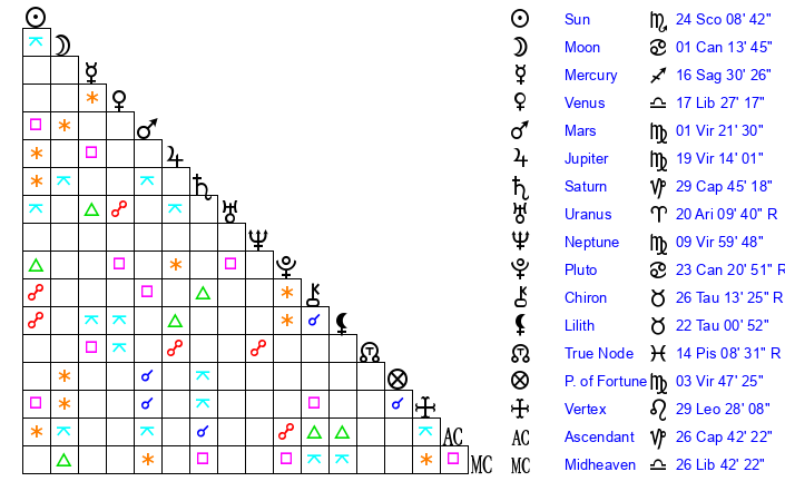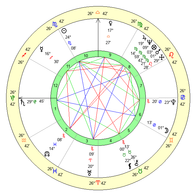 | Neptune | 7 Virgo 51 | 27 Pisces 18 | 5 Virgo 39 |