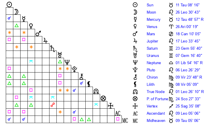 | Neptune | 4 Libra 15 | 27 Pisces 18 | 2 Libra 55 |