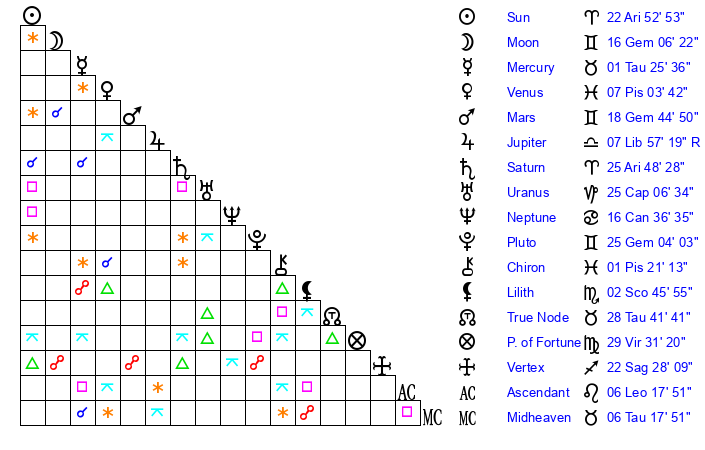 | Sun | 22 Aries 53 | 24 Aries 1 | 13 Leo 19 |