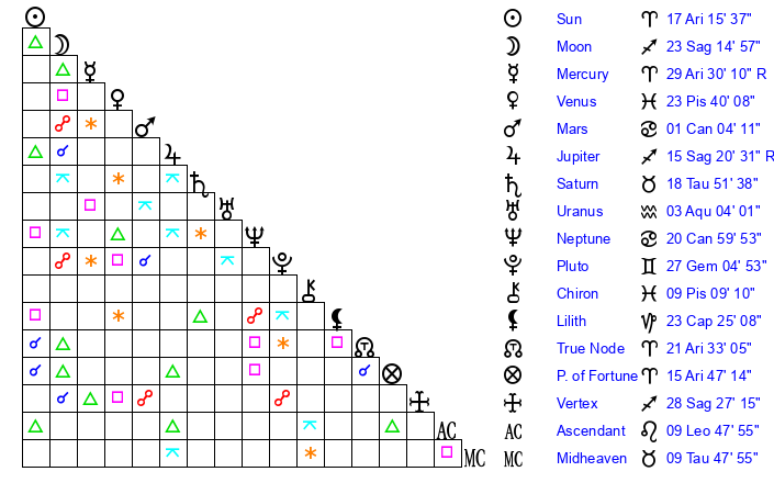 Moon | 23 Sagittarius 11 | 16 Leo 13 | 8 Aquarius 54 |