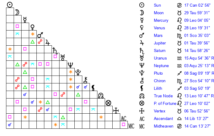 Moon | 29 Taurus 56 | 4 Capricorn 16 | 11 Taurus 30 |