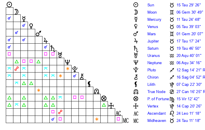 Sun | 15 Taurus 30 | 15 Taurus 27 | 9 Gemini 34 |