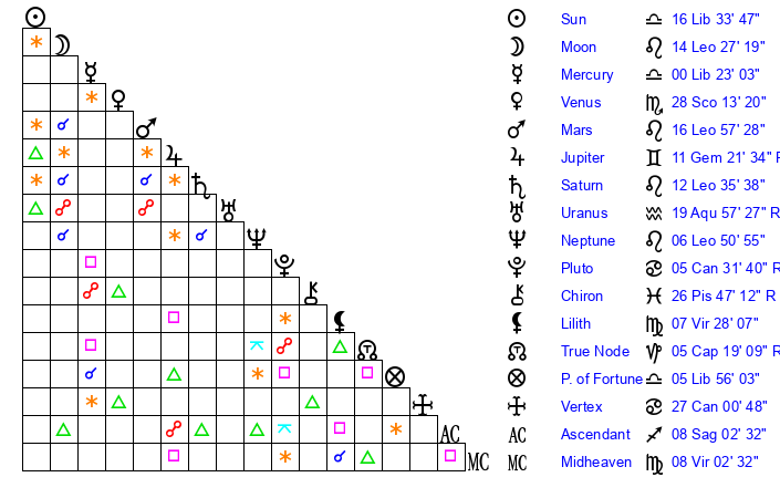 | Neptune | 6 Leo 51 | 0 Aries 17 | 5 Leo 43 |
