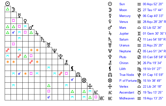 | Moon | 27 Taurus 19 | 0 Scorpio 12 | 21 Aries 56 |