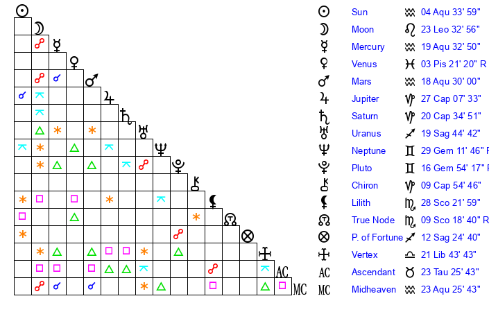 | Moon | 23 Leo 34 | 15 Sagittarius 38 | 12 Aquarius 12 |