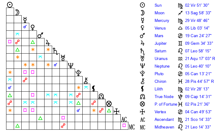 | Moon | 13 Sagittarius 56 | 13 Libra 44 | 29 Scorpio 21 |
