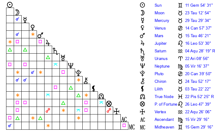 | Sun | 11 Gemini 55 | 12 Gemini 24 | 10 Virgo 57 |