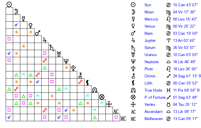 | Sun | 15 Cancer 43 | 16 Cancer 47 | 26 Virgo 55 |