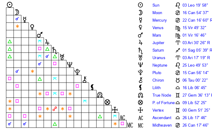 | Mercury | 22 Cancer 16 | 12 Leo 19 | 24 Scorpio 49 |