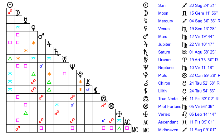 Jupiter | 21 Virgo 55 | 15 Gemini 36 | 17 Virgo 20 |