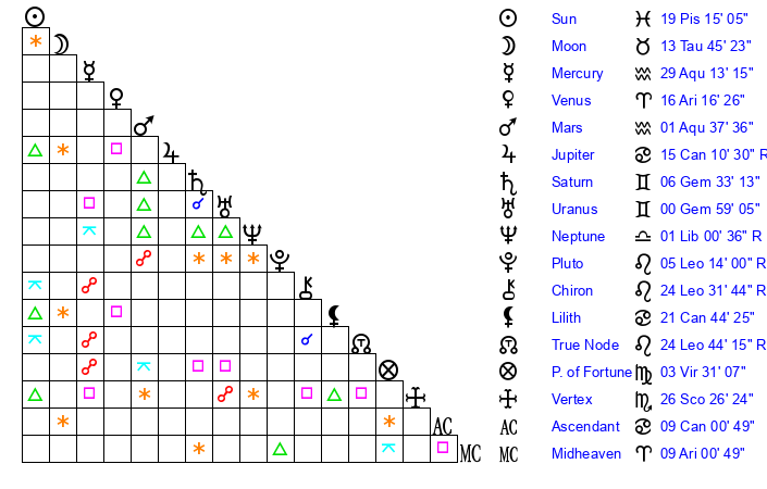 | Sun | 19 Pisces 15 | 20 Pisces 22 | 9 Gemini 22 |