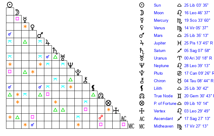 | Sun | 25 Libra 4 | 26 Libra 19 | 4 Aquarius 15 |