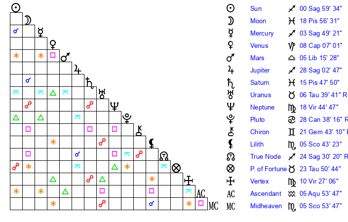 Sun | 0 Sagittarius 59 | 1 Sagittarius 39 | 0 Pisces 24 |