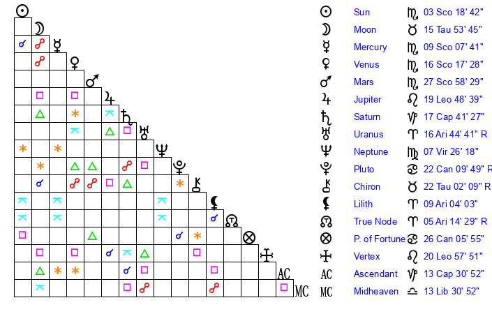 | Moon | 15 Taurus 59 | 12 Capricorn 8 | 29 Libra 29 |