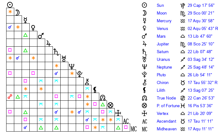 | Mercury | 17 Aquarius 31 | 16 Capricorn 43 | 16 Aquarius 28 |