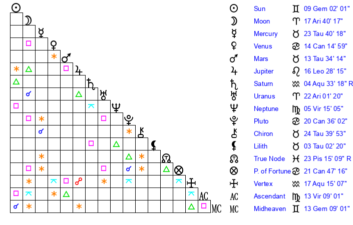 | Sun | 9 Gemini 2 | 9 Gemini 32 | 8 Virgo 3 |