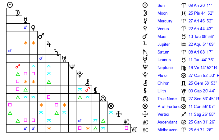 | Moon | 25 Pisces 43 | 27 Aries 55 | 2 Gemini 48 |