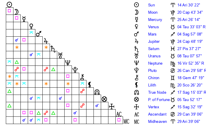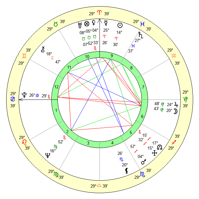 | Sun | 14 Aries 30 | 15 Aries 10 | 9 Cancer 24 |