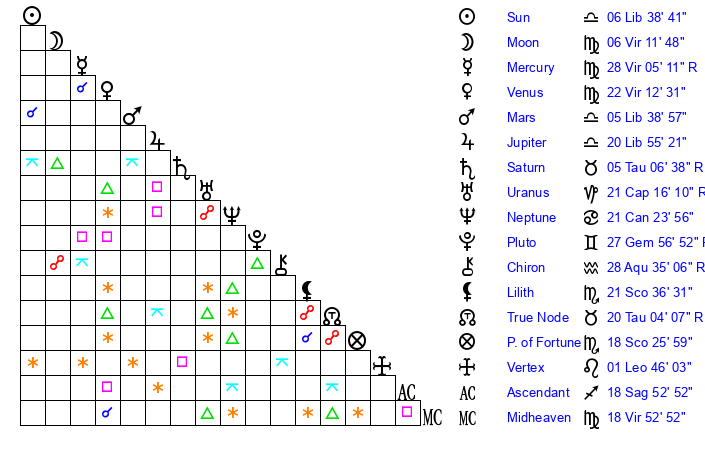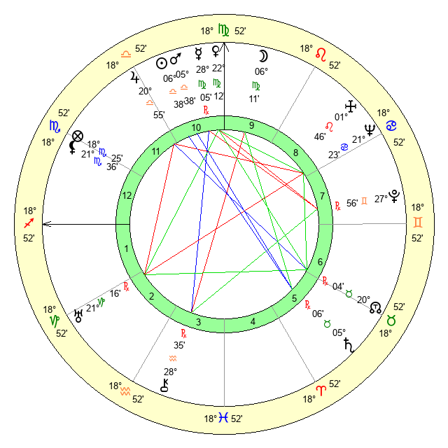 | Moon | 6 Virgo 5 | 15 Capricorn 51 | 18 Scorpio 13 |