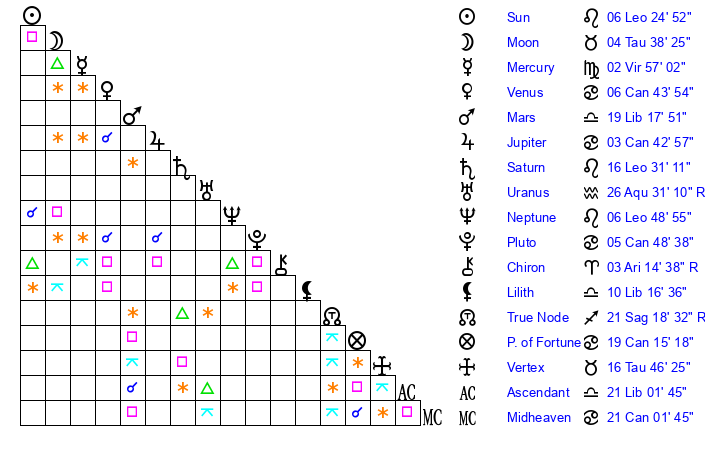 | Sun | 6 Leo 24 | 7 Leo 30 | 21 Scorpio 13 |