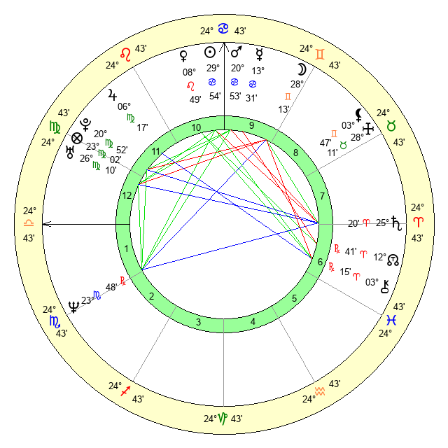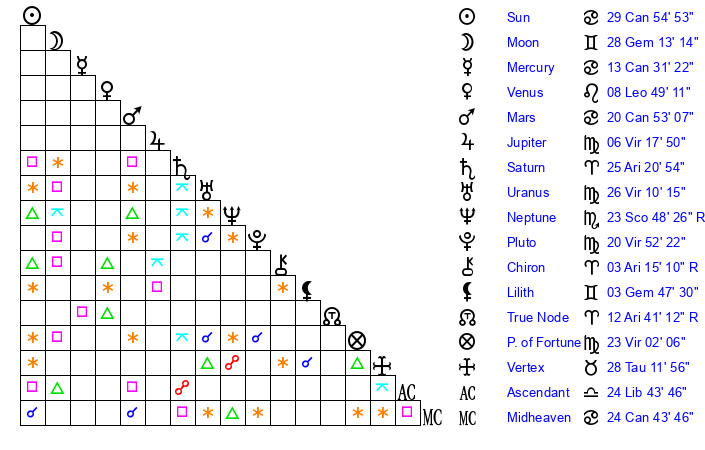 Sun | 29 Cancer 55 | 0 Leo 8 | 24 Virgo 51 |