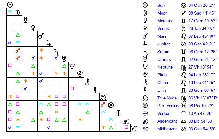 | Moon | 8 Sagittarius 44 | 22 Cancer 20 | 24 Sagittarius 8 |