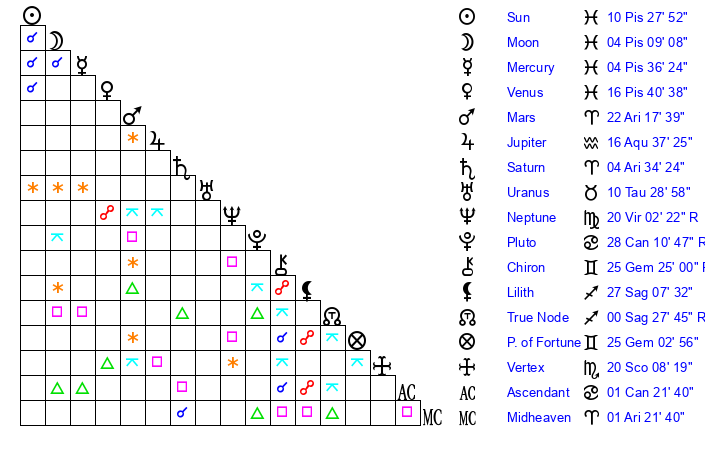 | Sun | 10 Pisces 27 | 11 Pisces 22 | 5 Gemini 44 |